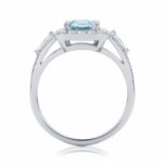 An emerald cut aquamarine sits at the heart of this 18ct white gold dress ring flanked by baguette cut diamonds. The shape of the three centre stones is echoed by a grain set diamond halo.